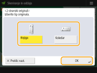 ![]() | Če želite optično prebrati izvirnike poljubne velikosti ali zelo prosojne izvirnike ali pri optičnem branju manjka rob slike, morate velikost dokumenta za optično branje določiti ročno. |