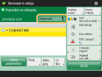 Preverjanje skupnega števila navedenih prejemnikovNa zgornjem desnem delu zaslona se prikaže število izbranih prejemnikov. Tako lahko pred pošiljanjem preverite, ali je število prejemnikov pravilno. ![]() Takojšen preklic opravila, ki se pošiljaČe med pošiljanjem opravila na nadzorni plošči pritisnete , se prikaže sporočilo <Ali je preklic naslednjega opravila oddajanja v redu?>. Če želite preklicati pošiljanje, pritisnite <Da>.Za izbiro opravila, ki ga želite preklicati, lahko izberete <Zadnje sprejeto opravilo> ali <Opravilo v pošiljanju>. <Opravilo za preklic ob pritisku na Stop> Če je v napravi več opravil za pošiljanje, pritisnite , da se prikaže zaslon, na katerem lahko izberete opravilo pošiljanja, ki ga želite preklicati. Če se poslano opravilo, ki ga želite preklicati, ne prikaže, pritisnite <Prev. druga opravila>, da prikažete možnost <Opravila oddajanja>. Izberite opravilo, ki ga želite preklicati, in pritisnite <Preklic>.Preverjanje stanja poslanih/shranjenih dokumentovStanje poslanih/shranjenih dokumentov lahko preverite na zaslonu <Nadzor stanja>. Na tem zaslonu lahko po preverjanju stanja ponovno pošljete/shranite dokument ali prekličete pošiljanje/shranjevanje. Preverjanje stanja in dnevnika optično prebranih dokumentov Ko je možnost <Prikaz obvestila, ko je opravilo sprejeto> nastavljena na <Vklj.>, je mogoče zaslon <Nadzor stanja> prikazati s tega zaslona, ki se prikaže, ko je poslano opravilo prejeto. <Prikaz obvestila, ko je opravilo sprejeto> ![]() Tiskanje poročila za pošiljanje/shranjevanjeČe na zaslonu z osnovnimi funkcijami optičnega branja pritisnete <Opcije> <Poročilo o rezultatu ODD>, lahko nastavite, da naprava samodejno natisne poročilo o pošiljanju/shranjevanju.Če želite v razdelku <Opcije> to nastaviti za vsa opravila, morate v razdelku <Poročilo o rezultatu ODD> izbrati <Samo ob napaki> ali <Izklj.> in nato nastaviti <Omogoči izpisovanje z opcij> na <Vklj.>. Ime datotekeKo je datoteka poslana/shranjena, se njeno ime samodejno oblikuje na podlagi naslednjih nastavitev oblikovanja. Nastavitve lahko spremenite tako, da bo oblikovano drugačno ime. Nastavitev imena datoteke Pri pošiljanju po e-pošti »Številka opravila (štiri mesta) _številka strani (tri mesta).pripona datoteke«, na primer »1042_001.jpg« Pri shranjevanju v datotečni strežnik »Leto, mesec, dan, ura, minute in sekunde, ko se datoteka shrani (14 mest).pripona datoteke«, na primer »20151030133541.jpg« Zadeva e-poštnega sporočilaSamodejno se uporabi zadeva, ki je vnesena v <Privzeta zadeva> (<Privzeta zadeva>). Če želite določiti drugo zadevo, spremenite nastavitev ali pa zadevo določite vsakič, ko pošljete e-pošto (Določanje nastavitev za e-pošto). |
