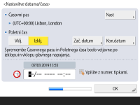 Nastavite datum in uro v napravi. ![]() ![]() Vnesite datum in čas, nato pritisnite <OK>. Po potrebi izberite <Časovni pas> in <Poletni čas>. Za dodatne informacije glejte Nastavitev datuma in ure. | |