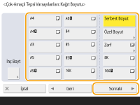 1 | <Özel Boyut> seçeneğine basın. ![]() Kağıt boyutunu <Serbest Boyut> olarak belirtebilirsiniz. Bu durumda kağıt boyutu ayarını girmenize gerek kalmaz. Kopyalama için boyutunu bilmediğiniz bir kağıt yüklediğinizde veya kağıt boyutu yazıcı sürücüsünde zaten kayıtlı olduğunda <Serbest Boyut> öğesini belirtin. |