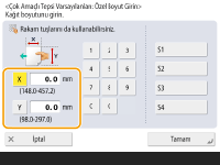 Sayı tuşlarını kullanarak her bir kenarın uzunluğunu girmek için <X> veya <Y> seçeneğine basın. ![]() Sık kullandığınız kağıt boyutlarını <S1> ile <S4> arasındaki düğmelere kaydederseniz, bunları tek bir dokunuşla çağırabilirsiniz. Serbest Boyutlu Kağıt (Özel Boyutlu Kağıt) Kaydetme | |