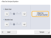 <Alarm Sesi>Faks gönderme veya alma işlemi tamamlandığında (alınan faksları yazdırma hariç) çıkan sesin ses düzeyini ve bir faks iptal edildiğinde veya bir hata nedeniyle sona erdiğinde çıkan sesin ses düzeyini ayarlayın. Sesi kapatmak için ses düzeyini en sola ayarlamak üzere