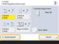 Fonksiyon kılavuzunu görüntülemeMakinenin fonksiyonlarıyla neler yapabileceğinizin yanı sıra kopyalama ve tarama gibi fonksiyonların kullanılmasına yönelik ipuçlarının sunulduğu bir ekran görüntülemek için <Eğitim Notları> seçeneğine basın. Hangi fonksiyonları nasıl kullanabileceğiniz hakkında daha fazla bilgi edinmek istediğinizde bu ekranı görüntüleyin. ![]() Örnek: Kopya fonksiyonları için eğitici Listeden öğe seçtiğinizde eğitici ekranı görüntülenir. ![]() Yardım fonksiyonunu kullanmaGörüntülenen fonksiyona bağlı olarak bazen ekranın sağ üst kısmında görüntülenir. Fonksiyonun açıklamasını ve işlem yöntemini kontrol etmek için seçeneğine basın.![]() Bir önceki ekrana dönmek için <Bitir> seçeneğine basın. Akıllı telefonla aynı şekilde çalıştırma (kaydırma/sürükleyip bırakma)Bazı ekranlarda, akıllı telefonda olduğu gibi parmağınızı ekranda yukarı/aşağı veya sola/sağa kaydırarak sayfayı değiştirebilir ya da kaydırabilirsiniz. ![]() ![]() Kaydırma işlemlerini devre dışı bırakmanız da mümkündür. <Flick Fonksiyonunu Kullan> <Ekran Renklerini Tersine Çevir> ayarı <Açık> olarak belirlendiğinde kaydırma ve sürükleyip bırakma işlemleri kullanılamaz. <Ekran Renklerini Tersine Çevir> Hareket edebilen düğmelerin bulunduğu ekranlarda düğmeler sürüklenip bırakılarak taşınabilir. ![]() |
