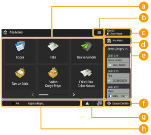 Yazdırma durumu, faks gönderme/alma durumu ve kullanım geçmişi gibi ayarları kontrol edebilirsiniz. Bu, kalan kağıt ve toner miktarı, hata durumu vb. bilgileri kontrol etmenizi de sağlar. Dokunmatik Ekran Panelinin Kullanılması