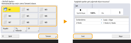 <Kopya> seçeneğine basın ve kaydetmek istediğiniz ayarları belirtin.