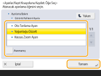 <Ana Menü> ekranında <Ayarlar/Kayıt Kısayolu> görüntülenmiyorsa <Ana Yönetim Ayarları> <Fonksiyon Ekranını Kısıtla> <Ayarla> seçeneğine basın. <Ayarlar/Kayıt Kısayolu> seçeneğini görüntülenecek şekilde ayarlayın.Kaydedilebilen kısayollar: 10 |