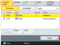 Kopyalama işleri beklerken, kontrol paneli üzerindeki seçeneğine basarsanız, tüm kopyalama işleri duraklatılır ve ardından <Durdur>İptal etmek istediğiniz Kopya işini seçin.> mesajı ve kopyalama işlerinin listesi görüntülenir. Listeden bir kopyalama işini seçebilir ve <İptal> seçeneğine basarak işi iptal edebilirsiniz. Kopyalama işlemine devam etmek isterseniz <Kpylmy Devm Et> seçeneğine basın. |