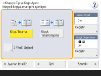 2-yönlü orijinallerle kitapçık kopyalama yaparken, <2-Yönlü Orijinal> seçeneğine basın ve gerektiğinde <Kitap Tipi> ya da <Takvim Tipi> seçeneğini belirleyin.