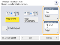 <Orijinal Boyut> öğesinde <Değiştir> seçeneğine basın ve orijinalin boyutunu seçin. <Oto> seçeneğini belirlerseniz, kitapçık boyutu orijinalin boyutuna göre otomatik olarak seçilir.