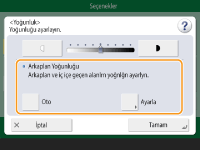 ![]() | Tüm orijinalin yoğunluğunu ayarlayabilirsiniz. Örneğin, yoğunluğu artırmak kalemle yazılan soluk görüntüleri kolayca okumanızı sağlar. Tüm Orijinalin Yoğunluğunu Ayarlama |