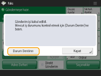 Belirlenen hedeflerin toplam sayısını kontrol etmek içinBelirlenen hedeflerin toplam sayısı ekranın üst kısmında görüntülenir. Bu, göndermeden önce hedef sayısının doğru olduğunu onaylamanızı sağlar. ![]() Gönderici bilgisiyle göndermek içinGöndericinin adını ve faks numarasıyla gönderebilirsiniz. <İletim Terminal Kimliği> Gönderilen belgelerin durumlarını kontrol etmek için<Durum Dentlm> ekranında, gönderilen belgelerin durumlarını kontrol edebilirsiniz. Bu ekran, durumlarını kontrol ettikten sonra faksları tekrar göndermenizi veya göndermeyi iptal etmenizi sağlar. Gönderilen ve Alınan Belgeler için Durum ve Günlüğü Kontrol Etme <İş Kabul Edildiğinde Bildirim Görüntüle> seçeneği <On> olarak ayarlandığında, bir gönderim işi alındıktan sonra gösterilen aşağıdaki ekranda <Durum Dentlm> ekranı görüntülenebilir. <İş Kabul Edildiğinde Bildirim Görüntüle> ![]() Alıcının hattının meşgul olmasından kaynaklanan bir iletim hatası oluştuğundaBelirli bir sürenin ardından makine otomatik olarak yeniden arama yapar. Makinenin kaç kez yeniden arama yapacağını ve yeniden aramalar arasındaki süre gibi ayarları değiştirebilirisiniz. <Otomatik Yeniden Ara> Gönderme sonuçlarına rapor yazdırmak içinFaks Temel Özellikleri ekranında, <Seçenekler> <İletim Sonucu Raporu> seçeneğine bastığınızda, gönderme sonuçlarının rapor listesini otomatik olarak yazdırmak üzere ayarlayabilirsiniz.Bunu her iş için <Seçenekler> bölümünde ayarlamak üzere, <İletim Sonucu Raporu> öğesinde <Sadece Hata İçin> veya <Kapalı> seçeneğini belirlemeniz ve daha sonra <Seçeneklerden Yazdırmaya İzin Ver> seçeneğini <Açık> olarak ayarlamanız gerekir. Birden fazla telefon hattı ayarlandığında<Seçenekler> <Hat Seçin> seçeneğine basarak faks gönderimi için kullanılacak telefon hattını seçebilirsiniz. Faks hattı ayarlarını belirlemeye ilişkin talimatlar için bkz. Faks Hattı Ayarları. |