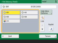 Sunucu makinenin tek dokunuş düğmelerinde kaydedilen hedefler aşağıdaki zamanlarda güncellenir: İstemci makineye bir faks işi gönderildiğinde İstemci makinede Sıfırla tuşuna bastığınızda İstemci makinede Otomatik Sıfırlama etkinleştirildiğinde |