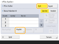IPSec ilkeleri3. adımda görüntülenen ekranda ilkeleri kaydedin. Bir ilkenin ayrıntılarını düzenlemek için listeden ilkeyi seçin ve <Düzenle> seçeneğine basın. Bir ilkeyi devre dışı bırakmak için listeden ilkeyi seçin ve <İlke Açk/Kpl> seçeneğine basın. Bir ilkeyi silmek için listeden ilkeyi seçin ve <Sil> <Evet> seçeneğine basın. |