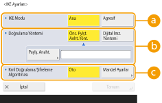 2 | Gerekli ayarları yapılandırın. ![]() <Geçerlilik>Oluşturulan IKE SA ve IPSec SA için bir geçerlilik süresi belirleyin. <Saat> veya <Boyut> ayarını yaptığınızdan emin olun. Her ikisini de ayarlarsanız geçerlilik süresi iki değerden birine ulaşıldığında sona erer. <PFS>Kusursuz İletme Gizliliği (PFS) fonksiyonunu <Açık> olarak ayarlarsanız, şifreleme anahtarının gizliliği artırılır ancak iletişim hızı daha düşüktür. Ayrıca, iletişim eş düzeyi cihazında PFS fonksiyonu etkinleştirilmelidir. <Kml Doğrulama/Şifreleme Algoritması>IKE aşama 2 için kimlik doğrulama ve şifreleme algoritmasının nasıl belirtileceğini ayarlamak için <Oto> veya <Manüel Ayarlar> seçeneğini belirleyin. <Oto> seçeneğini belirlerseniz ESP kimlik doğrulama ve şifreleme algoritması otomatik olarak ayarlanır. Belirli bir kimlik doğrulama yöntemi belirtmek isterseniz <Manüel Ayarlar> seçeneğine basın ve aşağıdaki kimlik doğrulama yöntemlerinden birini seçin.