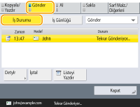 <Detaylar>  <Yeniden gönder> seçeneğine bastığınızda, gönderme/kaydetme başarısız olan belgeleri yeniden gönderebilir/yeniden kaydedebilirsiniz. Başka bir hedef belirlemek için <Hedefi Değiştir> seçeneğine basın. Aynı gönderme/kaydetme yöntemi kullanılarak belirlenen birden fazla hedefe sahip belgeler için, <Yayın Listesi> seçeneğine basın, hedefi seçin ve sonra <Yeniden gönder> veya <Hedefi Değiştir> seçeneğine basın.