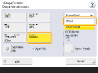 1 | <OOXML> seçeneğini ve açılır listede <Word> seçeneğini belirleyin.![]() ![]() OCR için kullanılacak dili değiştirmek için, <Ayrnt. Ayarla> <Değiştir> seçeneğine basın, bir dil seçin, <Tamm> seçeneğine basın.Taranmış belgelerde kullanılan dillere göre bir dil ya da dil grubu seçin. |