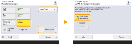 1 | <OOXML> seçeneğini ve açılır listede <PowerPoint> seçeneğini belirleyin. <Ayrnt. Ayarla> <OCR (Araşt. Metin)> seçeneğine basın.![]() |