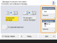 Натисніть кнопку <Змінити> у розділі <Формат оригіналу> і виберіть розмір оригіналу. Якщо вибрати <Авто>, розмір брошури буде вибрано автоматично відповідно до розміру оригіналу.