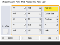 1 | <Custom Size> را فشار دهید. ![]() شما می توانید اندازه کاغذ را به صورت <Free Size> تعیین کنید، که دیگر نیازی به وارد کردن تنظیم اندازه کاغذ نباشد. هنگامی که کاغذی با اندازه نامشخص برای کپی بارگذاری می کنید یا زمانی که اندازه کاغذ از قبل در درایور چاپگر ثبت شده باشد، <Free Size> را مشخص کنید. |