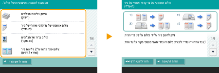 הצג את מדריך הפונקציותלחץ על <תפריט עזרה> כדי להציג מסך הסבר על השימוש בפונקציות של המכשיר וכן המלצות בנוגע לשימוש בצילום, בסריקה וכדומה. הצג מסך זה כשברצונך ללמוד עוד על הפונקציות הזמינות במכשיר ועל אופן השימוש בהן. ![]() דוגמה: הדרכה על פונקציות צילום כשבוחרים פריט מהרשימה מוצג מסך ההדרכה. ![]() שימוש בפונקציית העזרהכתלות בפונקציה המוצגת כעת, לעיתים מוצגת בחלקו הימני העליון של המסך. לחץ על כדי לבדוק את התיאור ואת שיטת ההפעלה של הפונקציה.![]() לחץ על <סיום> כדי לחזור למסך הקודם. פעל באותו האופן כמו עם מכשיר טלפון חכם (החלק במהירות/גרור ושחרר)במסכים מסוימים, ניתן לעבור עמוד או לגלול באמצעות החלקה מהירה של האצבע מעלה/מטה או שמאלה/ימינה על המסך כפי שעושים בטלפון חכם. ![]() ![]() ניתן גם להשבית את פעולות ההחלקה המהירה. <שימוש בפונקציית החלקה מהירה> לא ניתן להשתמש בפעולות החלק במהירות ופעולות גרור ושחרר כאשר <הפוך צבעי מסך> מוגדר ל <מופעל>. <הפוך צבעי מסך> במסכים עם לחצנים הניתנים להזזה, ניתן לגרור ולשחרר את הלחצנים כדי להזיז אותם. ![]() |