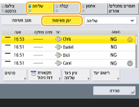 לחיצה על <פרטים> <שליחה חוזרת> מאפשרת לשלוח שוב את המסמכים ששליחתם נכשלה. כדי לציין יעד אחר, לחץ על <שינוי יעד>. עבור מסמכים עם יעדים מרובים שצוינו באמצעות אותה שיטת שליחה, לחץ על <רשימת שידור>, בחר יעד ולאחר מכן לחץ על <שליחה חוזרת> או על <שינוי יעד>.ניתן לשלוח שוב מסמכים כאשר האפשרות <מחיקת משימות שידור שנכשלו> מוגדרת כ-<כבוי> (<מחיקת משימות שידור שנכשלו>). שים לב כי לא ניתן לשלוח שוב מסמכים שנשלחו באמצעות שליחה ישירה/שליחה ידנית/שליחת פקס ממחשב. ניתן לשנות את היעדים של מסמכים המוגדרים להישלח בזמן מסוים, וכן את היעדים של מסמכים ששליחתם נכשלה. שים לב כי אינך יכול לשנות את היעדים של מסמכים שצוינו להם יעדים מרובים ונמצאים בתהליך של שליחה, או כאשר ישנה הגבלה על הזנת יעד חדש (Limiting Available Destinations). ניתן לשנות את היעד עבור משימה שבוטלה עקב שגיאות שידור, או עבור משימה הממתינה להישלח במצב 'שליחה מושהית'. לא ניתן לשנות יעדים מרובים בפעם אחת. כמו כן, לא ניתן לשנות את היעדים בקבוצה בפעם אחת. |