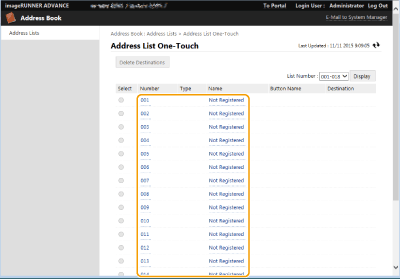 2 | לחץ על [Not Registered] או מספר בנגיעה אחת שאינו רשום. [Not Registered] יוצג ב- [Name] עבור לחצנים בנגיעה אחת שאינם רשומים. כדי להציג לחצנים בנגיעה אחת שאינם מוצגים ברשימה, בחר את טווח המספרים ב- [List Number], לאחר מכן לחץ על [Display]. ![]() |