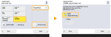 1 | בחר <OOXML> בחר <PowerPoint> מהרשימה הנפתחת. לחץ על <הגדרת פרטים> <OCR (עם חיפוש טקסט)>.![]() |
