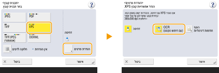 אם תבחר <PDF; OCR>, <XPS; OCR>, או <OOXML; OCR> כתבנית הקובץ, והאפשרות <סריקה חכמה> תוגדר כ-<מופעל> ב-<>/<OCR (Text Searchable) Settings>, כיוון מסמך המקור יזוהה, והמסמך יסובב באופן אוטומטי לפני שליחתו, לפי הצורך. <OCR (עם חיפוש טקסט) הגדרות> אם תבחר <PDF> או <XPS> כתבנית הקובץ, תוכל להגדיר <דחיסה> ו-<OCR (עם חיפוש טקסט)> באותו הזמן. במקרה זה, <PDF; דחיסה> או <XPS; דחיסה> יוצג כתבנית הקובץ במסך תכונות הסריקה והשליחה הבסיסיות. אם תבחר <Word> עבור <OOXML>, תוכל להגדיר כי תמונות הרקע שנסרקו יימחקו. ניתן להפיק קבצי Word שקל לערוך אותם, ללא תמונות בלתי רצויות. <כלול תמונות רקע בקובץ Word> |
