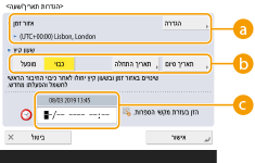 הגדר את התאריך/השעה של המכשיר. יש לקבוע הגדרות אלו כהלכה היות והתאריך/שעה משמשים למקרים כגון שליחת דואר אלקטרוני באופן אוטומטי בזמן שצוין.