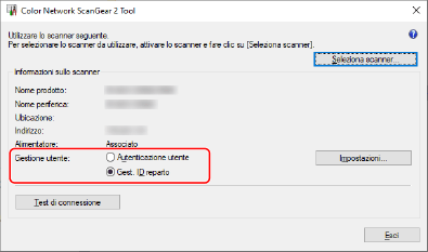 In questo caso, salvare le informazioni di autenticazione in precedenza nella finestra di dialogo [Impostazioni ID/PIN reparto] di Color Network ScanGear 2 Tool per poter usare la funzione di gestione utente.