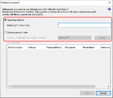 Per specificare l'indirizzo IP o il nome host dello scanner