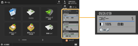 「コピー」や「スキャンして送信」など同じ設定や宛先を繰り返し使用している方に便利な機能です。一度使用した設定が履歴としてタイムラインに自動で追加されるので、その履歴を押すと同じ設定を呼び出すことができます。