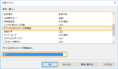 [デバイスの設定]タブの[デバイスのセキュリティー印刷機能]にチェックマークを付ける