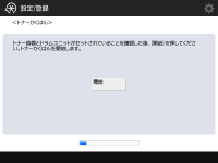 <トナーかくはん>画面が表示された場合は、トナーをかくはんして初期調整を行います。 ![]() <用紙の設定>画面が表示された場合は、Step 3に進みます。 ![]() <開始>を押して、トナーをかくはんします。終了の画面が表示されたら<OK>を押します。 | |