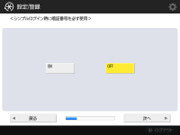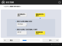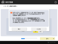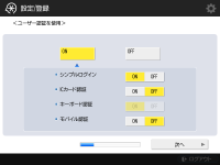 本機のセキュリティーを高めるために、ユーザー認証を使用する体制で運用してください。 ![]() ![]() <ユーザー認証を使用>の<ON>を押して使用するログイン方法の<ON>を押し、<次へ>を押します。 ユーザー認証を使用しない場合は、<ユーザー認証を使用>の<OFF>を押したあと<OK>を押し、Step 6へ進みます。 ![]() 本機に「Administrator」ユーザー以外に管理者が登録されていない場合は、次の設定を行います。 ![]() 本機のセキュリティーを高めるため、新規に管理者を登録して「Administrator」ユーザーを無効にする場合は、<はい>を押します。<管理者ユーザーの登録>で<ユーザー名>、<パスワード>を押してそれぞれ入力し、<OK>を押します。必要に応じて<Eメールアドレス>、<部門ID>、<表示名>を設定してください。詳しくは、ローカルデバイスにユーザー情報を登録するを参照してください。「Administrator」ユーザーは次回ログイン時から無効になります。 「Administrator」ユーザーで運用する場合は、<いいえ>を押します。 ![]() ![]() ログイン画面を表示するタイミングを選びます。<機能選択時に表示>を選んだ場合は、<ファンクション>を押して、ログイン画面を表示させる機能を選び、<OK>を押します。また、<設定/登録>画面でどの項目を設定するときにログイン画面を表示させるかを選びます。 <シンプルログイン>と<キーボード認証>を<OFF>にした場合は、<OK>を押します。Step 6へ進みます。 <シンプルログイン>または<キーボード認証>を<ON>にした場合は、<次へ>を押します。 ![]() ![]() ログイン画面でテンキー入力のみによる認証を使用する場合は、<ON>を押します。 <シンプルログイン>を<OFF>にした場合は、<OK>を押します。Step 6へ進みます。 <シンプルログイン>を<ON>にした場合は、<次へ>を押します。 ![]() ![]() シンプルログインで暗証番号の入力を強制したい場合は<ON>/強制しない場合は<OFF>を押し、<次へ>を押します。 ![]() ![]() プリント機能に適した状態でシンプルログインを使用したい場合は、<ON>を押します。強制留め置き印刷が有効になり、パソコンからの印刷データを利用してユーザー登録したり、プリントするユーザーに適したログイン画面をデフォルト表示にしたりする設定になります。詳しくは、強制留め置き印刷の設定をする、<ユーザーの登録方法>、<シンプルログイン画面のデフォルト表示の変更>を参照してください。 ![]() ![]() シンプルログイン画面のプリセットボタン数を選び、<OK>を押します。 本機はログインサービスにUser Authentication(個人認証管理)を使用する設定になっています。詳しくは、個人認証管理を開始するを参照してください。 | |