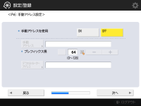 ネットワークに接続するための設定をします。 ![]() ![]() <IPv4を使用>または<IPv6を使用>の<ON>を押し、<次へ>を押します。IPv4/IPv6両方を使用することもできます。 <IPv4を使用>と<IPv6を使用>を<OFF>にして<OK>を押すと、ネットワークの設定を行わずにStep 10へ進みます。 ![]() <IPv4を使用>を<ON>にした場合は、次の設定を行います。 ![]() IPアドレスを自動で取得する場合は、<DHCP>または<Auto IP>を押し、<次へ>または<OK>を押します。 IPアドレスを手動で設定する場合は、<DHCP>または<Auto IP>の選択を解除して、<IPアドレス>、<サブネットマスク>、<ゲートウェイアドレス>を押してそれぞれ入力し、<次へ>または<OK>を押します。 IPv4アドレスの設定について詳しくは、IPv4アドレスを設定するを参照してください。 ![]() <IPv6を使用>を<ON>にした場合は、次の設定を行います。 ![]() ステートレスアドレスを使用する場合は<ON>/使用しない場合は<OFF>を押し、<次へ>を押します。 IPv6アドレスの設定について詳しくは、IPv6アドレスを設定するを参照してください。 ![]() ステートレスアドレスを設定したあと、次の設定を行います。 ![]() 手動アドレスを使用する場合は<ON>/使用しない場合は<OFF>を押し、<次へ>を押します。 手動アドレスを使用する場合は、<手動アドレス>、<プレフィックス長>、<デフォルトルーターアドレス>を押してそれぞれ入力します。 ![]() 手動アドレスを設定したあと、次の設定を行います。 ![]() DHCPv6を使用する場合は<ON>/使用しない場合は<OFF>を押し、<OK>を押します。 | |