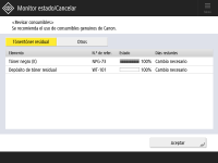 (Monitor estado/Cancelar), se muestra la pantalla Monitor estado, donde se pueden revisar el nivel de tóner u otras indicaciones de estado.
