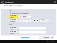 Especifique la dirección del servidor DNS, el nombre del host DNS y el nombre del dominio DNS. ![]() ![]() Pulse <Servidor DNS primario> y <Servidor DNS secundario>, introduzca la dirección IPV4/IPv6 para el servidor DNS y pulse <Siguiente>. Para obtener información sobre las opciones de la dirección del servidor DNS, consulte Configurar opciones de DNS. ![]() ![]() Pulse <Nombre de host> para introducir el nombre del equipo (nombre de host). Pulse <Nombre de dominio> para introducir el nombre de dominio al que pertenece el equipo, y pulse <Siguiente>. Si las opciones de IPv4 y IPv6 son iguales, pulse <Sí> para <Usar el mismo nombre de host/nombre de dominio que para IPv4>. ![]() ![]() Para actualizar automáticamente mediante las Opciones de actualización dinámica de DNS, pulse <Sí> para <Actualización dinámica de DNS>, y pulse <Aceptar>. Si configura <Actualización dinámica de DNS> para <IPv6> como <Sí>, seleccione <Sí> para registrar los elementos automáticamente. | |