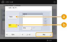 3 | 必要时设置端口号,然后按<确定>。 设置是否指定端口号。通过指定例外地址的端口号可以配置详细的通信限制。 <不指定>例外地址设置适用于所有从特定IP地址接收的通信。 <指定>例外地址设置仅适用于从使用指定端口号的特定 IP 地址接收的通信。按<添加>,输入端口号,然后按<确定>。每个 IPv4/IPv6 的例外地址最多可以注册 50 个端口。 |