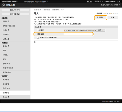 导入已导出的设置数据时,将需要在[加密密码]中输入的密码。使用字母数字字符。