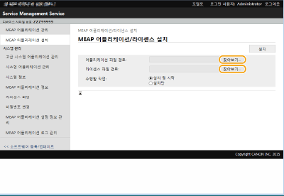 MEAP 응용 프로그램에 따라 사용 설명서 또는 관련 소프트웨어를 다음 URL에서 다운로드할 수 있습니다. http://canon.com/fau/downloads MEAP 응용 프로그램 버전 업그레이드는 설치와 같은 과정을 거칩니다. 설치하기 전에 SMS 화면의 MEAP 응용 프로그램을 중단하십시오. MEAP 응용 프로그램 관리 응용 프로그램이 사용할 수 있는 저장 장치의 최대 용량은 약 4GB입니다. |