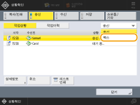 여러 개의 전송 작업이 있을 때 취소할 전송 작업을 선택하기 위한 화면을 표시하려면 (중지)을 누릅니다. 취소하려는 전송 작업이 표시되지 않으면 <기타 작업 확인>을 눌러서 <송신 작업 일람>을 표시합니다. 취소하려는 작업을 선택하고 <취소>를 누릅니다.