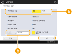 3 | 필요한 설정을 지정하고 <확인>를 누릅니다. ![]() <Administrator 사용>관리자를 사용하는 경우 <설정>에 설정합니다. <암호화 비밀번호>인증과 다른 비밀번호를 사용하는 경우 <인증과 같은 비밀번호 사용>의 선택을 해제하고 <암호화 비밀번호>을 누른 후 비밀번호를 입력합니다. ![]() "관리자"가 비활성화되었으면 <Administrator 설정>을 설정할 수 없습니다(<Administrator 사용> 설정이 <해제>로 고정됨). |