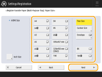 1 | Press <Custom Size>. ![]() You can specify the paper size as <Free Size>, which eliminates the need to enter the paper size setting. Specify <Free Size> when you load paper of unknown size to use for copying or when the paper size is already registered in the printer driver. |