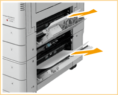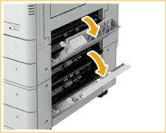 ![]() | Ouvrez le capot supérieur droit et le capot inférieur droite de la cassette à papier. ![]() |