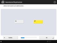 Se si apre la schermata <Utilizzo vassoio di consegna opzionale>, specificare se si utilizzeranno eventuali vassoi di consegna aggiuntivi. ![]() Se si apre la schermata <Impostazioni data/ora>, procedere al passo 6. ![]() Per abilitare il vassoio di uscita, premere <On> oppure premere <Off> per disabilitarlo e premere <OK>. Gli elementi visualizzati variano a seconda delle opzioni installate. | |