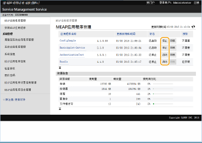 如果单击位于运行状态右侧的[开始]/[停止]按钮,可以开始/停止使用MEAP应用程序。