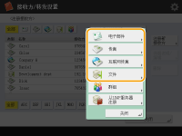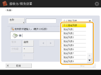 ![]() | 可以在“地址簿”中注册接收方的传真号码或电子邮件地址,以便在发送已扫描原稿时使用。也可以在“地址簿”中将互联网传真接收方、文件服务器文件夹位置(IP地址和路径)、Canon多功能打印机*的存储(高级存储箱)注册为接收方。 *仅适用于imageRUNNER ADVANCE系列 |