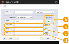 1 | 输入发送数据的文件服务器/高级存储箱的主机名。 ![]() 有关文件服务器/高级存储箱的信息,请咨询网络管理员。 <通信协议>从<Windows(SMB)>、<FTP>和<WebDAV>中选择文件服务器的通信协议。 将文档发送到高级存储箱时,选择<Windows(SMB)>或<WebDAV>。 ![]() 如果选择<Windows(SMB)>,会显示<检索主机>和<浏览>按钮。通过搜索或查看网络,可以轻松指定文件服务器/高级存储箱。 <浏览>中最多可以注册并使用五个 LDAP 服务器。 <主机名>输入文件服务器/高级存储箱的主机名。 如果选择<FTP>协议,请按如下方式输入<主机名>。 TLS禁用时 示例: 保存到“共享空间”:ftp://主机名/share 保存到“个人空间”:ftp://主机名/users TLS启用时 示例: 保存到“共享空间”:ftps://主机名/share 保存到“个人空间”:ftps://主机名/users 将文档发送到高级存储箱时,按如下所示输入<主机名>。 如果选择<Windows(SMB)>协议 示例: 保存到“共享空间”:\\192.168.100.50\share 保存到“个人空间”:\\192.168.100.50\users 如果选择<WebDAV>协议 TLS禁用时 示例: 保存到“共享空间”:http://<IP地址或主机名> 保存到“个人空间”:http://<IP地址或主机名> TLS启用时 示例: 保存到“共享空间”:https://<IP地址或主机名> 保存到“个人空间”:https://<IP地址或主机名> <检查连接>输入主机名后按此按钮确认与文件服务器/高级存储箱的连接。 ![]() 使用“个人认证管理”等登录服务时,需要输入<用户名>和<密码>。 |