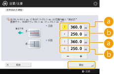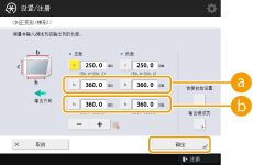 3 | 对于正面及反面输入<b>和<h>值。 ![]() <b>输入测试页上<b>标记的测量长度。 <h>输入测试页上<h>标记的测量长度。 下面示例,为<b>设置360.0毫米的长度,为<h>设置355.5毫米的长度造成0.5毫米的歪曲差异被自动校正。 |